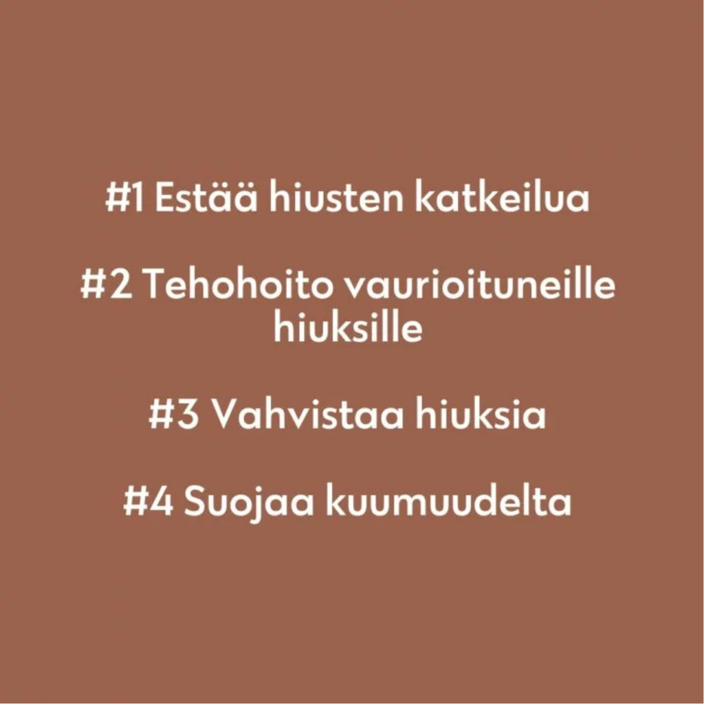 Levitä kosteisiin tai kuiviin hiuksiin tarpeen mukaan. Anna vaikuttaa ja jätä hiuksiin — ei huuhdella pois. Käytä säännöllisesti hoidon ylläpitämiseksi.