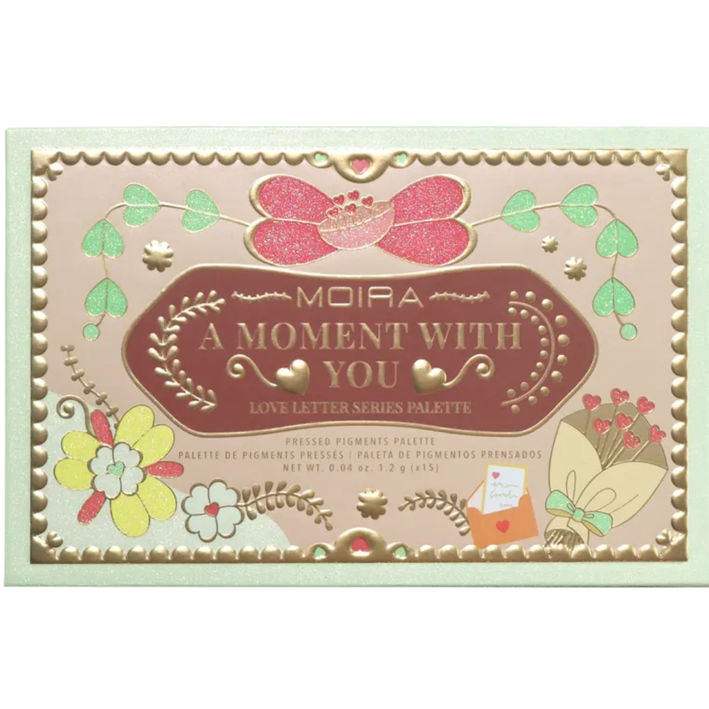 MOIRA Love Letter -sarja on saanut inspiraationsa menneistä ja nykyisistä rakkauden hetkistä. Jokainen paletti sisältää yhteensä 15 sävyä, joiden joukossa on upeita helmiäis-, dual chrome- ja mattasävyjä - täydellisiä luovien silmämeikkien aikaansaamiseen. Paletin avulla voit luoda monipuolisesti erilaisia meikkilookkeja. A Moment With You on kaikki mitä tarvitset!